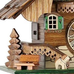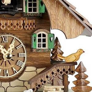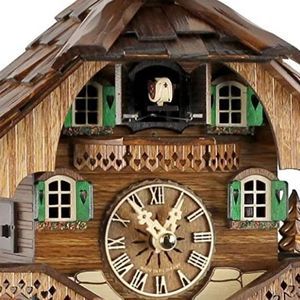 Reseña: Su material principal es la madera y su diseño nos recuerda a las típicas casitas de la selva negra alemana. Funciona con pilas y su péndulo es muy silencioso. Es una pequeña obra de arte llena de figuras complementarias que la hacen muy decorativa. Contempla un sistema de sensores para que no salga en la oscuridad si activas esa opción. El sonido del pajarito resulta muy agradable y tienes la opción de ajustar el sonido para que suene más fuerte o más bajo.