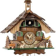 Reseña: Su material principal es la madera y su diseño nos recuerda a las típicas casitas de la selva negra alemana. Funciona con pilas y su péndulo es muy silencioso. Es una pequeña obra de arte llena de figuras complementarias que la hacen muy decorativa. Contempla un sistema de sensores para que no salga en la oscuridad si activas esa opción. El sonido del pajarito resulta muy agradable y tienes la opción de ajustar el sonido para que suene más fuerte o más bajo.