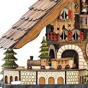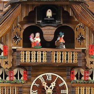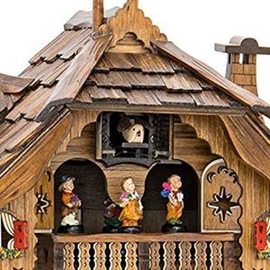 Reseña: Inspirado en los chalets de la selva negra, está lleno de figuras y ofrece múltiples espectáculos visuales. Las coloridas figuras de baile en la parte superior se trabajan con gran detalle y cambian cuando se reproduce la música (cada hora). Al mismo tiempo, la rueda del molino gira y sus dos figuras infantiles pintadas a mano también suben y bajan cada hora en su columpio después de que el cuco ha llamado.